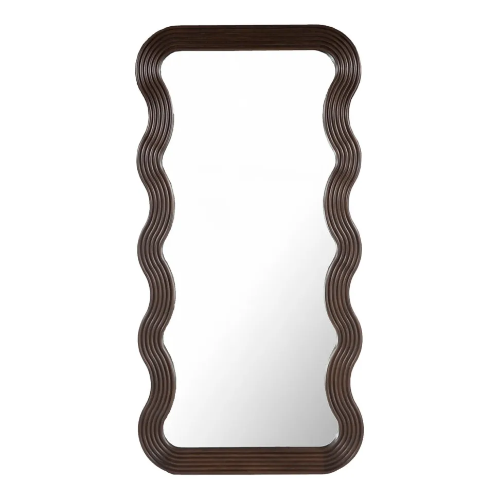 Spiegel ‘Mayfield’ van Richmond Interiors is een indrukwekkende organisch gevormde spiegel met een sierlijke, golfvormige rand van mangohout. De houten omlijsting is voorzien van een ribbelpatroon, wat diepte en textuur toevoegt aan het natuurlijke materiaal. Met een hoogte van 170 centimeter biedt Mayfield een volledig beeld, ideaal om jezelf van top tot teen te bekijken.