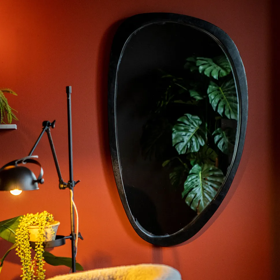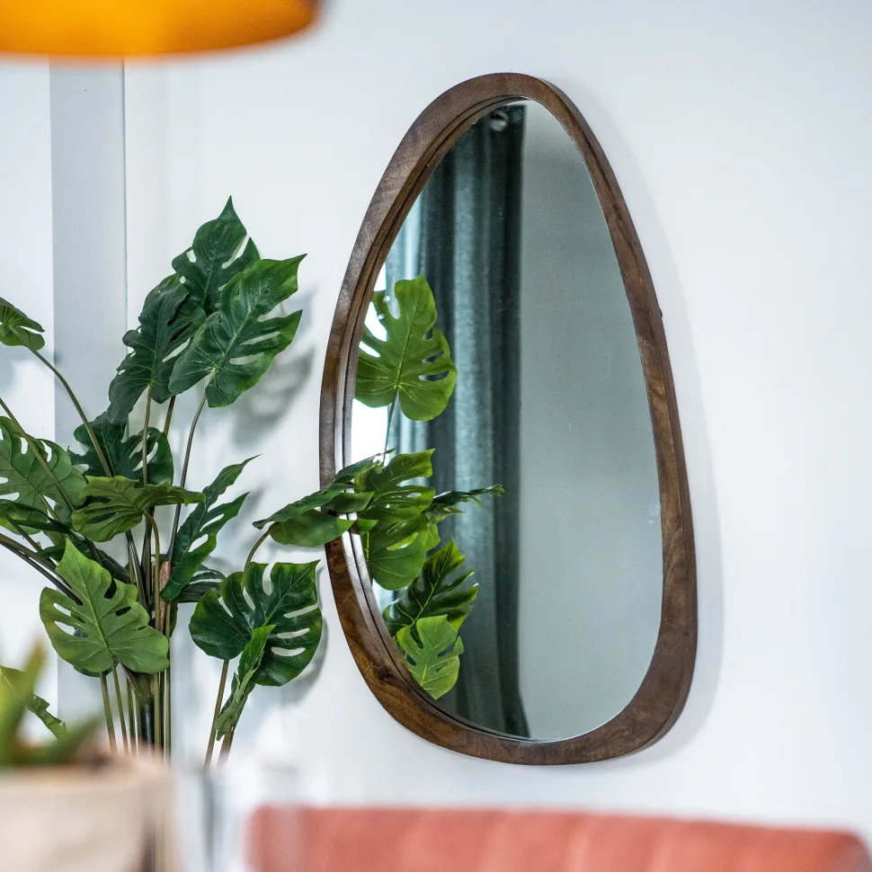 Spiegel ‘Plecto’ van By-Boo is een organisch gevormde spiegel met een warme, natuurlijke uitstraling. De rand is vervaardigd uit gelakt mangohout, wat zorgt voor een rijke houtstructuur en een verfijnde afwerking. Dankzij de vloeiende lijnen en asymmetrische vorm voegt Plecto een speels, kunstzinnig element toe aan elk interieur.
