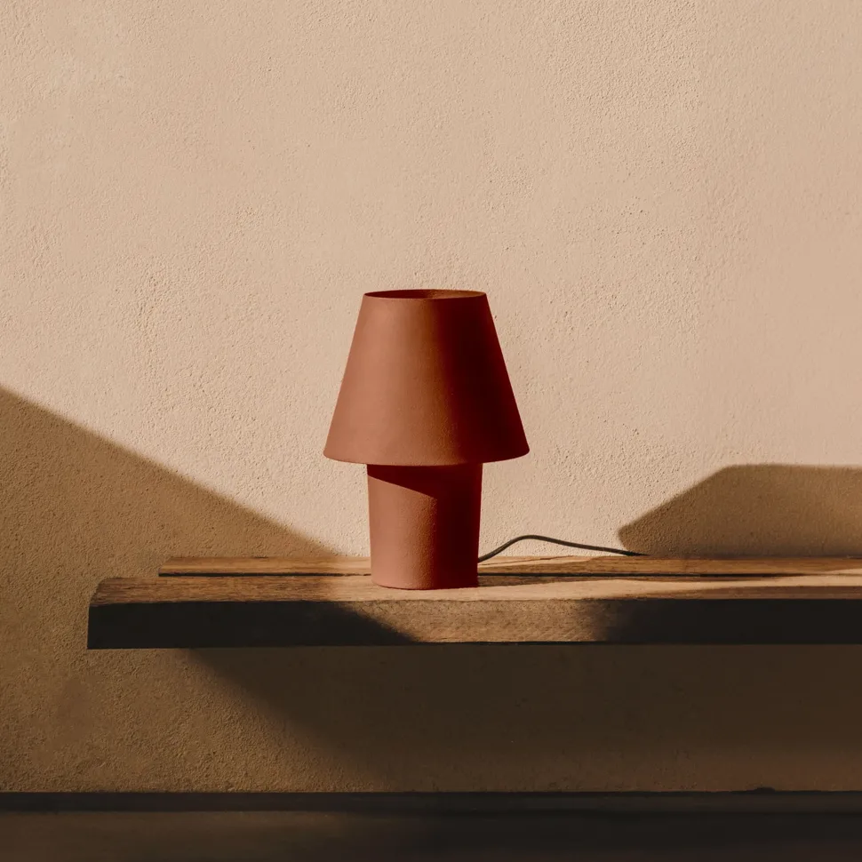- Tafellamp van metaal met een finish van gestructureerde terracottaverf.