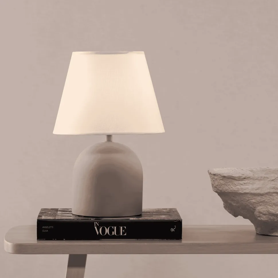 De tafellamp Jatasha heeft een afgerond grijs betonnen onderstel en een witte linnen lampenkap. Deze lamp is perfect om op een bankje te zetten als interieurdetail of om de kamer te verlichten. Door het stijlvolle ontwerp past de lamp gemakkelijk bij een andere inrichting in de kamer en geeft het een huiselijke indruk aan de kamer. De lampenkap dempt het licht een beetje, wat een aangenaam licht geeft voor de filmavond of een etentje met de familie.
