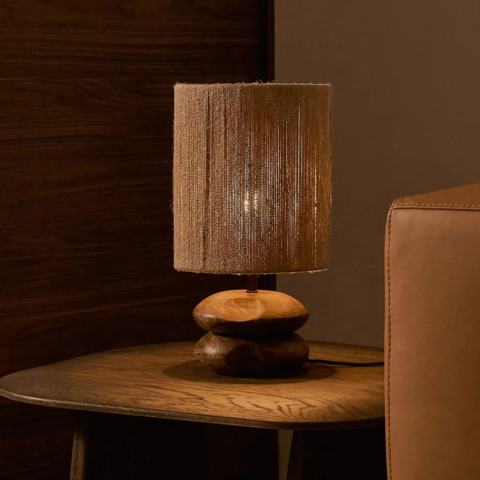 - Tafellamp van acaciahout met donkere afwerking en kap van jutekoord.