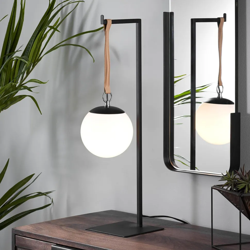 - Tafellamp met hangende matglazen kap vastgehouden door leren strip.