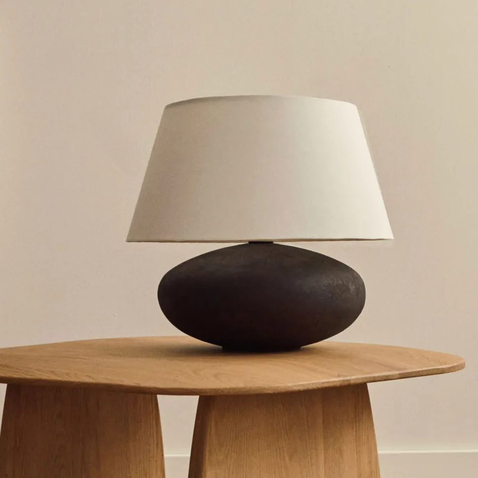 - Tafellamp van metaal in een zwarte terracotta-achtige afwerking.