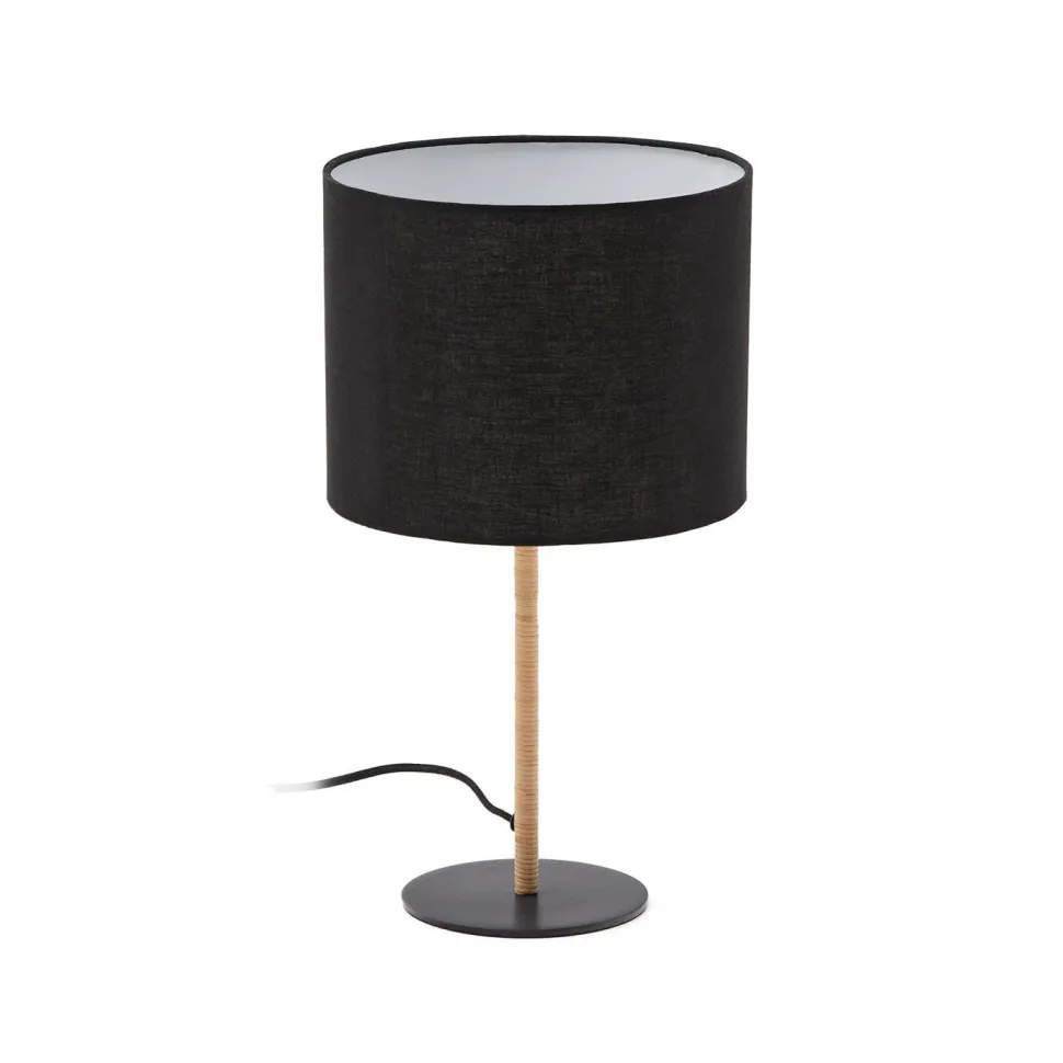 - Metalen tafellamp met detail van natuurlijk rotan en een zwarte katoenen lampenkap.