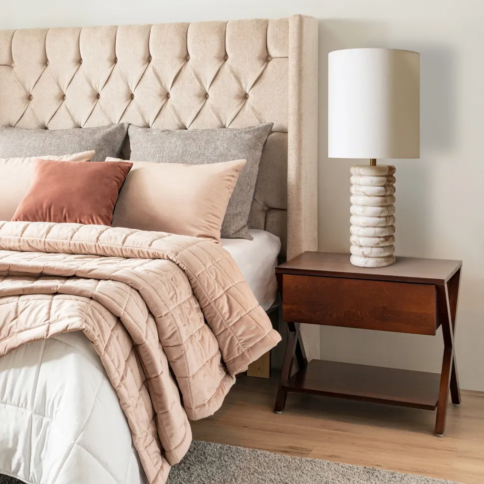 Geef je huis een tijdloze esthetiek en luxe charme met deze elegante tafellamp van marmer en linnen. De combinatie van fijn marmer, messing en linnen maakt deze lamp tot een stijlvol hoogtepunt dat een verfijnde sfeer toevoegt aan elke kamer. De massief marmeren voet zorgt niet alleen voor stabiliteit, maar ook voor een aantrekkelijke, moderne uitstraling. Het natuurlijke marmer met zijn individuele korrel maakt elke lamp uniek en voegt een luxueus tintje toe aan je huis. De combinatie van natuursteen en minimalistische vormen geeft de lamp een tijdloze elegantie die moeiteloos past in verschillende interieurstijlen. De voet van de tafellamp wordt aangevuld met een slanke messing buis, die het uiterlijk van de marmeren voet versterkt en voor extra stabiliteit zorgt. Het glanzende messing vormt een stijlvol contrast met het marmer en geeft de lamp een moderne maar luxueuze uitstraling. De ivoorkleurige linnen kap zorgt voor een warme, diffuse lichtspreiding en creëert zo een aangename, gezellige sfeer. Het matte oppervlak van de linnen stof past harmonieus bij het elegante ontwerp van de lamp en kan perfect worden gecombineerd met verschillende inrichtingsstijlen.
