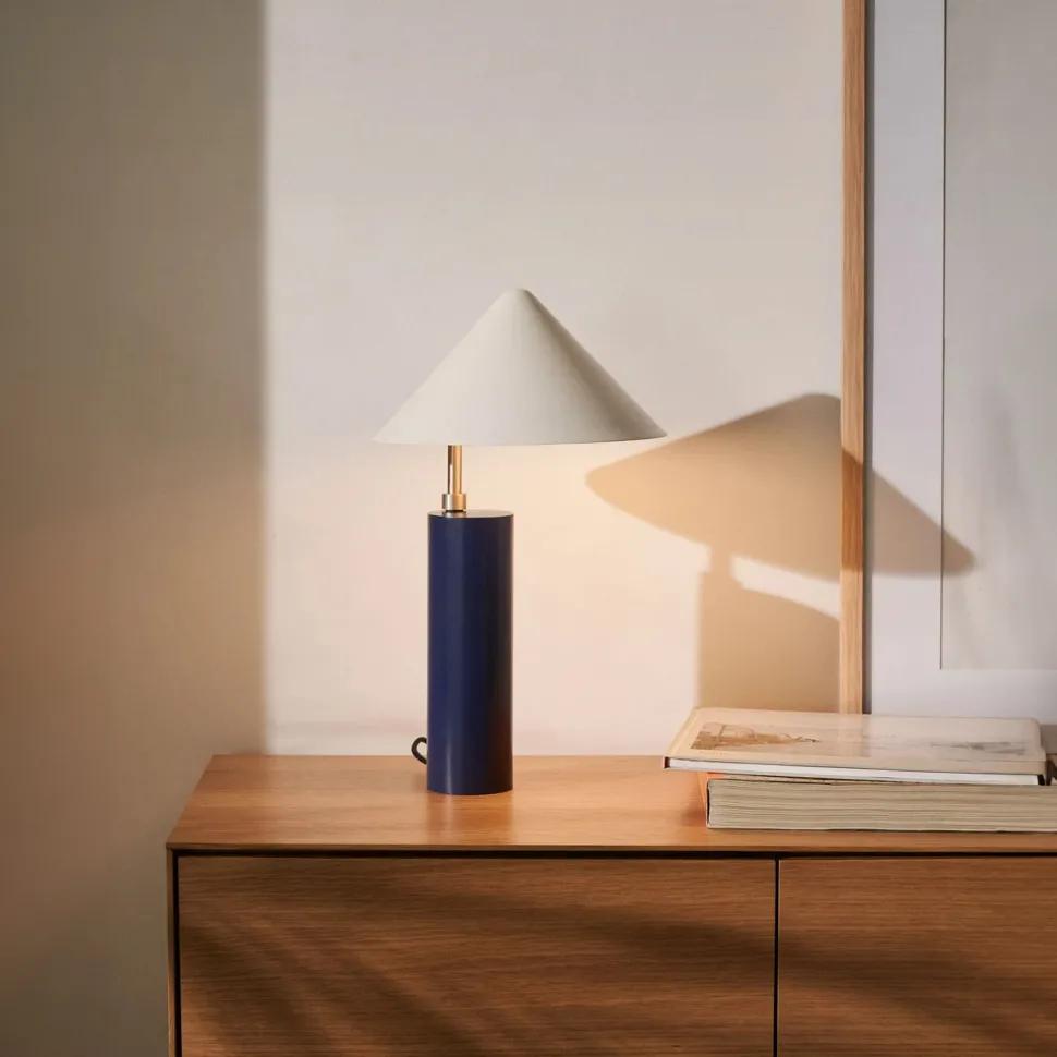 - Tafellamp van blauw en wit gelakt metaal.