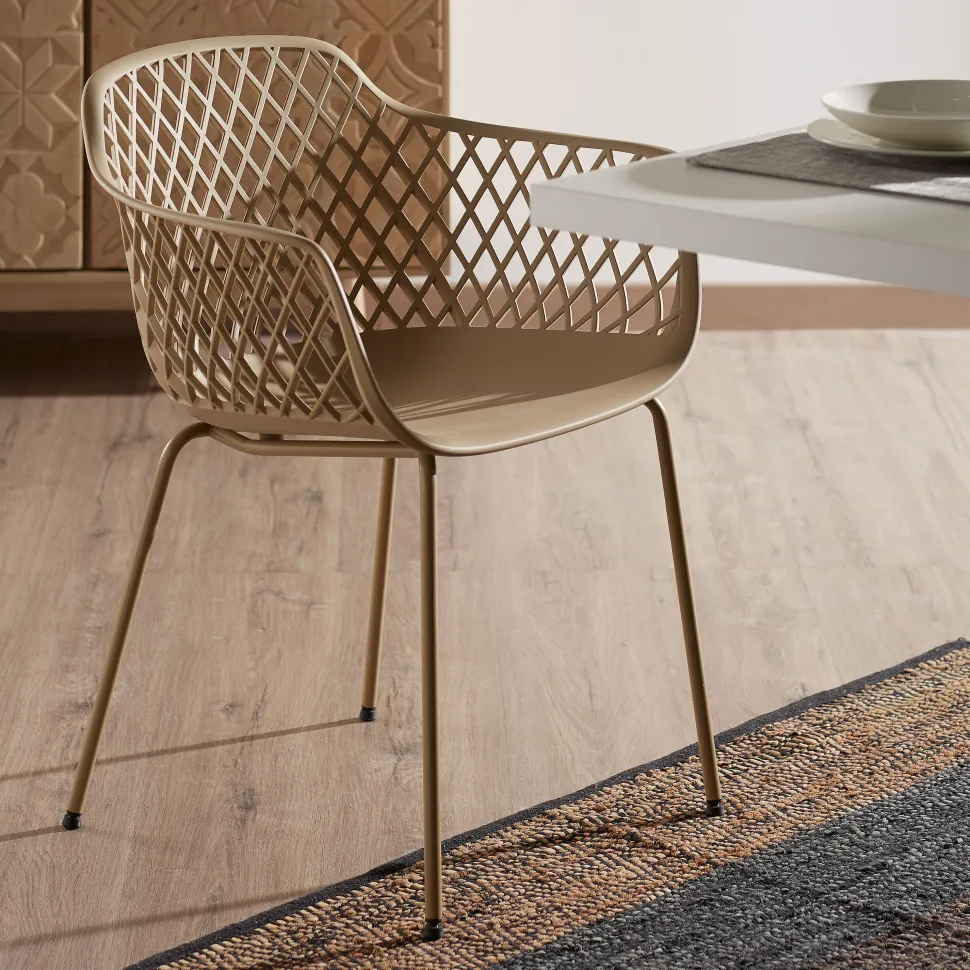 Recyclebare kunststof. Goed voor het milieu én prachtig in jouw woning. Dat is ‘Quinn’ van het Spaanse merk Kave Home. De eetkamerstoel kun je in jouw eethoek een plekje geven, maar natuurlijk ook bij een bureau of wat dacht je van in de tuin? De zitting van kunststof kan namelijk wel tegen een stootje. De opengewerkte zitting maakt van dit exemplaar een opvallende verschijning en biedt genoeg comfort voor urenlang tafelen.