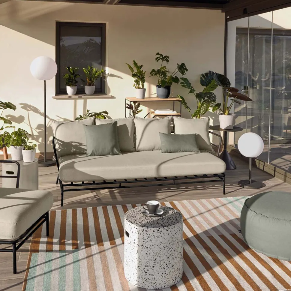 Staal is de hoofdrolspeler bij deze bank: dit item combineert comfort en stijl dankzij een ‘licht’ design dat het gevoel van ruimtelijkheid en lichtheid in de ruimte bevordert. Én uitnodigt tot maximale ontspanning binnen of op overdekte terrassen.