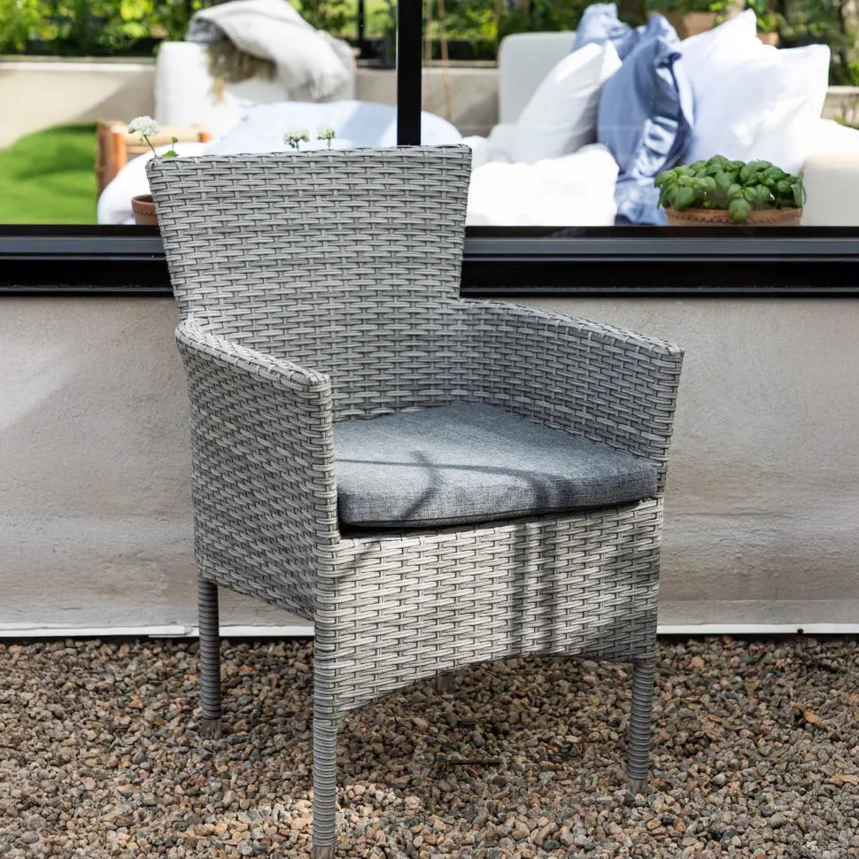 Modern, stijlvol en duurzaam – wat wil je nog meer? In deze heerlijke fauteuil uit de Theressa serie kun je in de zomer genieten van vele etentjes met je geliefden. Met een frame van aardbeige aluminium en synthetisch rotan krijg je een robuuste stoel die de tand des tijds doorstaat. Zit comfortabel deze zomer en geniet van heerlijke maaltijden buiten! De stoel is stapelbaar.