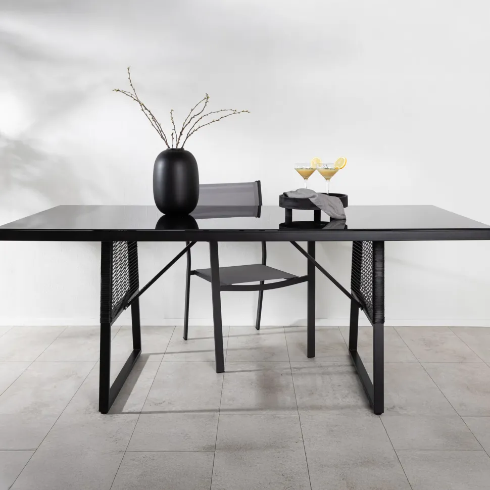 Marye is een rechthoekige eettafel van zwart aluminium. Het tafelblad is van donker glas, het onderstel heeft mooie touwdetails die de tafel een eigenwijze en smaakvolle uitstraling geven. Combineer met stoelen uit dezelfde serie voor een complete eetgroep. Maak je klaar voor heerlijke zomermomenten met familie en vrienden!