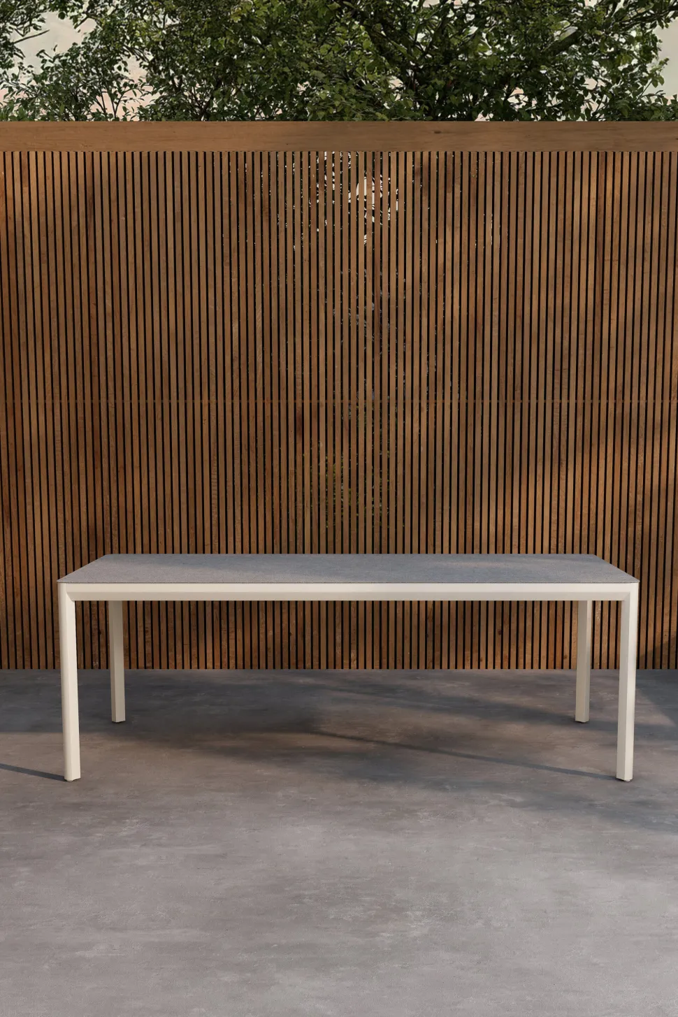 Maak een stijlvolle en handige eethoek buiten met de Zachari-eettafel. Het minimalistische ontwerp van de tafel met strakke lijnen en een beige aluminium frame geeft hem een moderne uitstraling die perfect past op het terras, de patio of in de tuin.