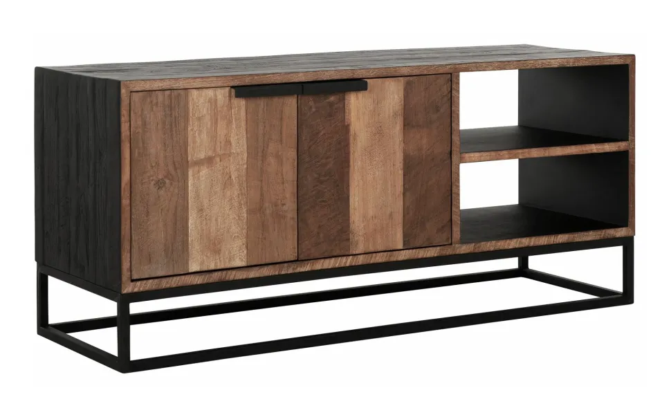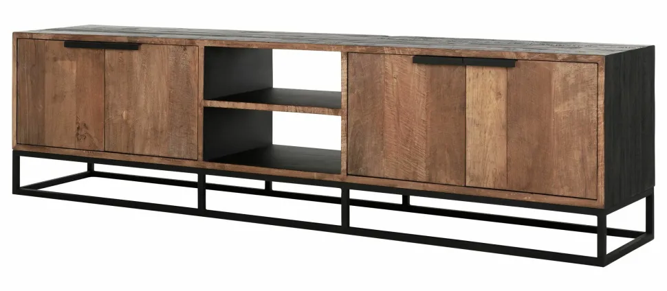TV meubel Cosmo combineert naturel en zwart teakhout en is hiermee een opvallende verschijning. De afmetingen van het meubel zijn 55x165x40 cm met 3 deuren en 2 open vakken.