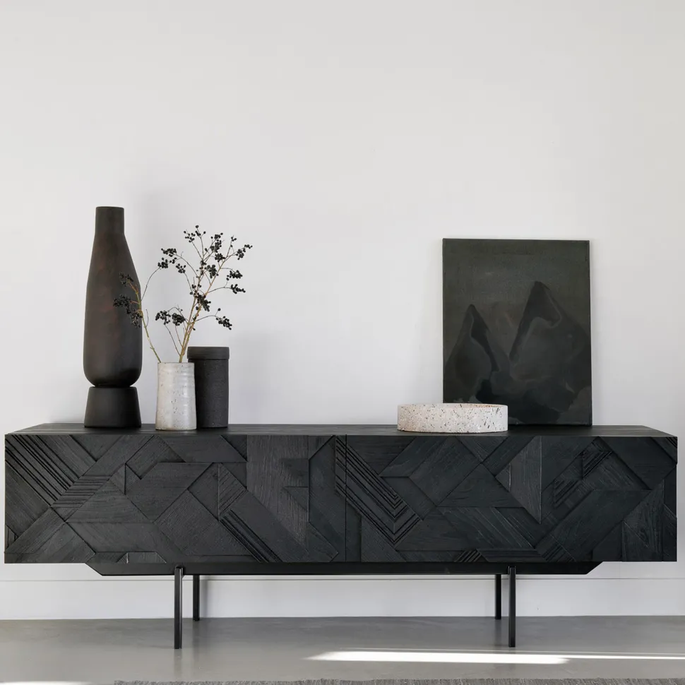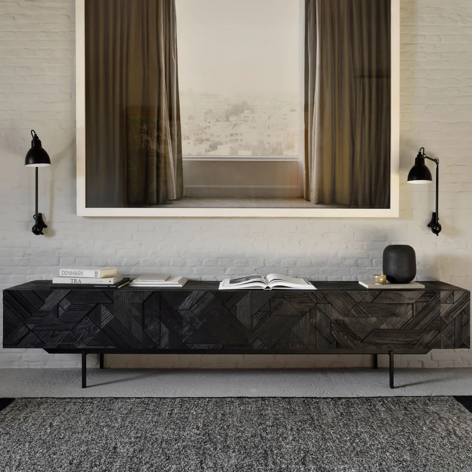 In zijn zoektocht om beweging toe te voegen aan het oppervlak, begon onze ontwerper Alain van Havre driehoekige vormen in lagen te maken en te combineren. Voor hij het wist, had hij een interessante compositie van teakhout gecreëerd. We borstelden het oppervlak om de nerven te benadrukken en het gevoel van beweging te accentueren. Het patroon, dat oorspronkelijk werd gebruikt voor onze populaire Graphic buffetkast uit teakhout, werkt ook bijzonder goed in de vorm van een nieuw tv-meubel.