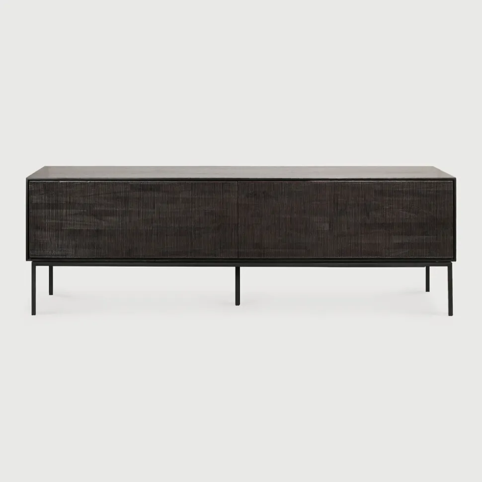 Het Grooves tv-meubel uit massief teakhout zit vol ritme en dynamiek. Elke lijn is met de hand gesneden, waardoor ieder stuk werkelijk uniek is. Kleine imperfecties zijn deel van het verhaal, sterker nog: ze geven Grooves nog meer karakter. Het resultaat is elke keer een iets ander oppervlak, elk met zijn eigen ritme en dynamiek. Het prachtige donkergetinte teak zit ook aan de binnenkant, waar planken en lades voor een veilige opbergruimte zorgen.