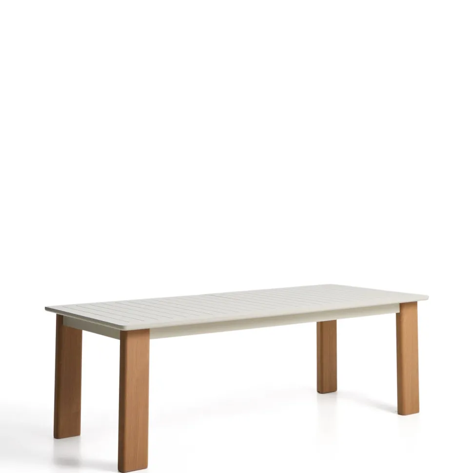 De Livorno uitschuifbare tafel valt op door zijn evenwicht tussen design en functionaliteit. Hij is gemaakt van aluminium en combineert lichtheid met bestendigheid tegen oxidatie, corrosie en blootstelling aan de zon. De poten, met een natuurlijke houtlook, zorgen voor visuele warmte zonder dat dit ten koste gaat van de bestendigheid en het onderhoudsgemak van aluminium. Het uitschuifbare systeem heeft een vlindermechanisme waarmee het eenvoudig te openen is en bevat een verborgen verlengstuk in de tafel, waardoor de grootte van de tafel kan worden aangepast aan de ruimte of het aantal gasten. Bovendien zijn de poten voorzien van plastic beschermers om de vloer te beschermen en de oppervlakken na verloop van tijd in goede staat te houden.