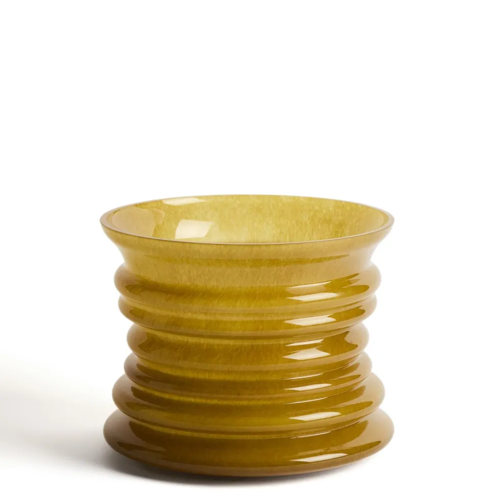 De Ambere vaas valt op door de ringen in reliëf die langs het oppervlak lopen en ritme toevoegen aan het ontwerp. Hij is gemaakt van in de massa geverfd glas, een techniek waarbij de kleur direct in het materiaal wordt opgenomen, waardoor een uniforme tint wordt verkregen die niet vervaagt. Een decoratief object met strakke lijnen en een solide uitstraling dat past in verschillende ruimtes en stijlen.