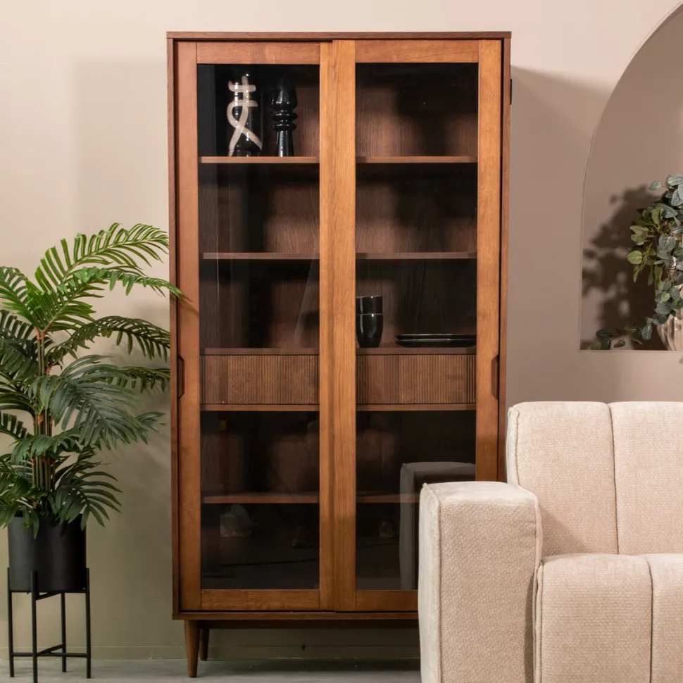 – Vitrinekast Jule is verkrijgbaar in naturel en walnoot kleurig eikenhout