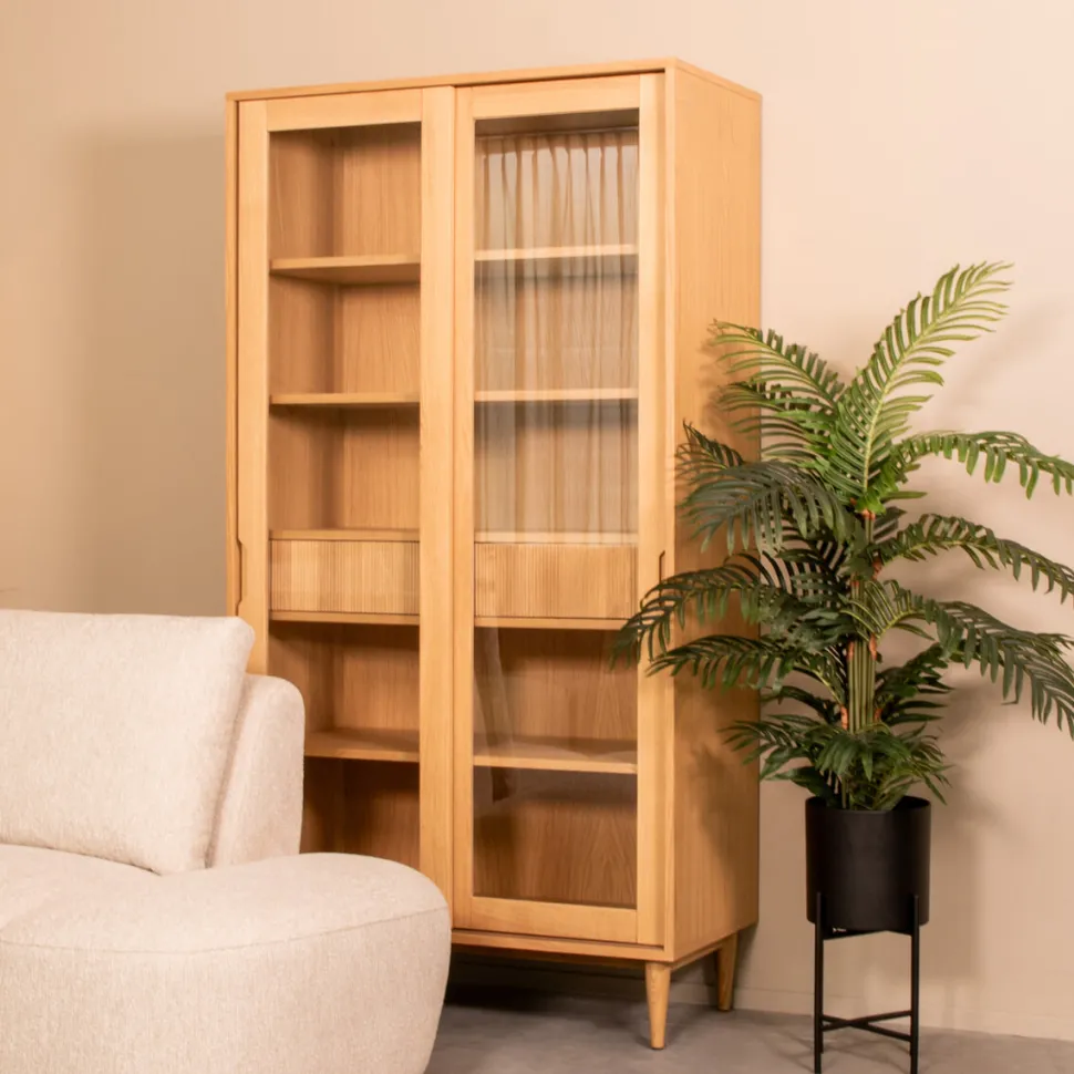 Vitrinekast Jule van LABEL51 is een trendy meubel uitgevoerd in eikenfineer. Een strak vormgegeven meubel waar al jouw spullen in opgeborgen kunnen worden.