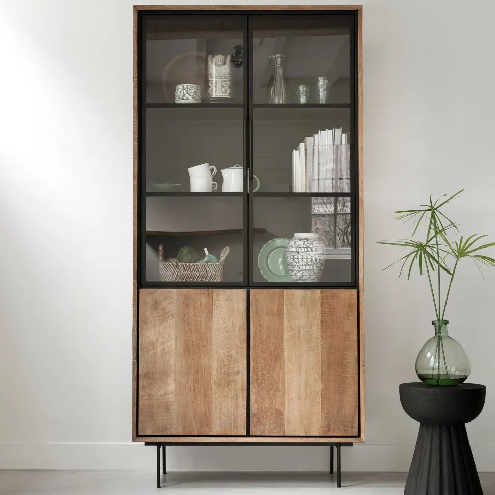 Vitrinekast Metropole is een combinatie van teakhout en glas. De vitirinekast heeft ronde, metalen pootjes. De Metropole collectie kenmerkt zich door het verjongen van de randen van kastdeurtjes en tafelbladen. Vitrinekast Metropole small heeft 2 glazen deuren en 2 houten deuren. De afmetingen van de vitrinekast zijn 210x100x40 cm.