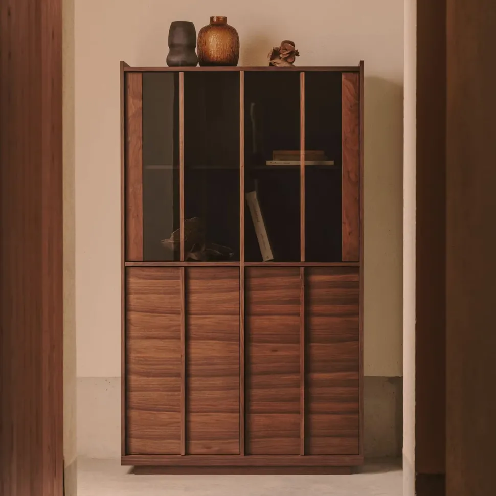 Vitrinekast Onix van Kave Home straalt pure elegantie uit. Gemaakt van massief notenhout en afgewerkt met notenfineer in een diepe, donkere tint, ademt deze kast luxe en verfijning. De deuren zijn voorzien van gerookt gehard glas, waardoor de inhoud subtiel zichtbaar blijft, net genoeg om nieuwsgierig te maken zonder alles prijs te geven.