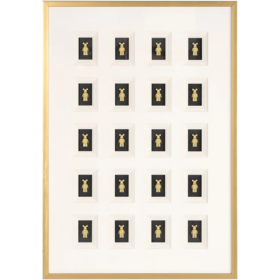 Wall art Bear block 3D is een verfijnd en modern kunstwerk dat een strakke, minimalistische compositie biedt met een opvallend driedimensionaal effect. De herhaling van gouden blokvormen op een strakke witte achtergrond creëert een harmonieus patroon dat rust en symmetrie uitstraalt. De combinatie van zwart, wit en goud geeft het werk een tijdloze en luxe uitstraling, waardoor het een subtiel, maar krachtig statement maakt in elke ruimte. Of je het nu plaatst in een woonkamer, hal of kantoor, Wall art Block 3D voegt een vleugje moderne elegantie toe aan je interieur en trekt de aandacht met zijn intrigerende, gestructureerde details.