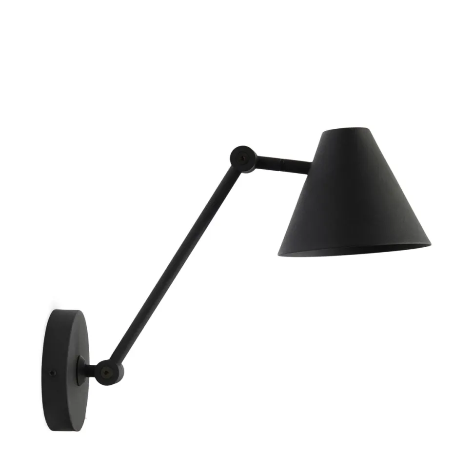 De RM Metal Wall Lamp is een strakke lamp voor aan de muur. De wandlamp is gemaakt van ijzer en heeft een coating in zwart. Je kunt de industriële wandlamp verstellen; op twee plaatsen bevinden zich scharnieren. De kap is klassiek te noemen; deze heeft een conische, toelopende vorm.