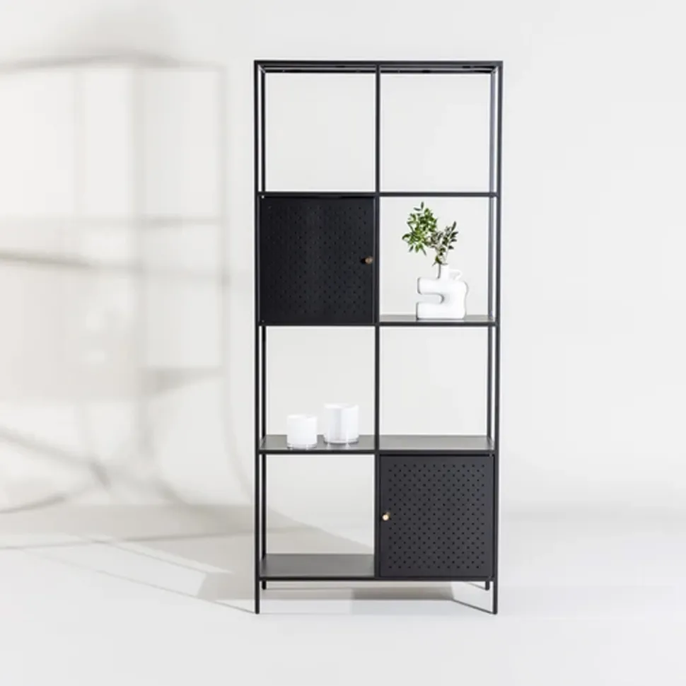 Met zijn hoge en smalle ontwerp biedt deze plank een unieke combinatie van open en verborgen opbergruimte op de vier ruime planken. Twee kastjes op verschillende hoogtes met elegante messingkleurige knoppen bieden een perfecte plek om kleine spullen te verbergen en een georganiseerd oppervlak te creëren. De open planken zijn ontworpen om je mooie decoraties of kandelaars te laten zien en brengen een gevoel van gezelligheid.