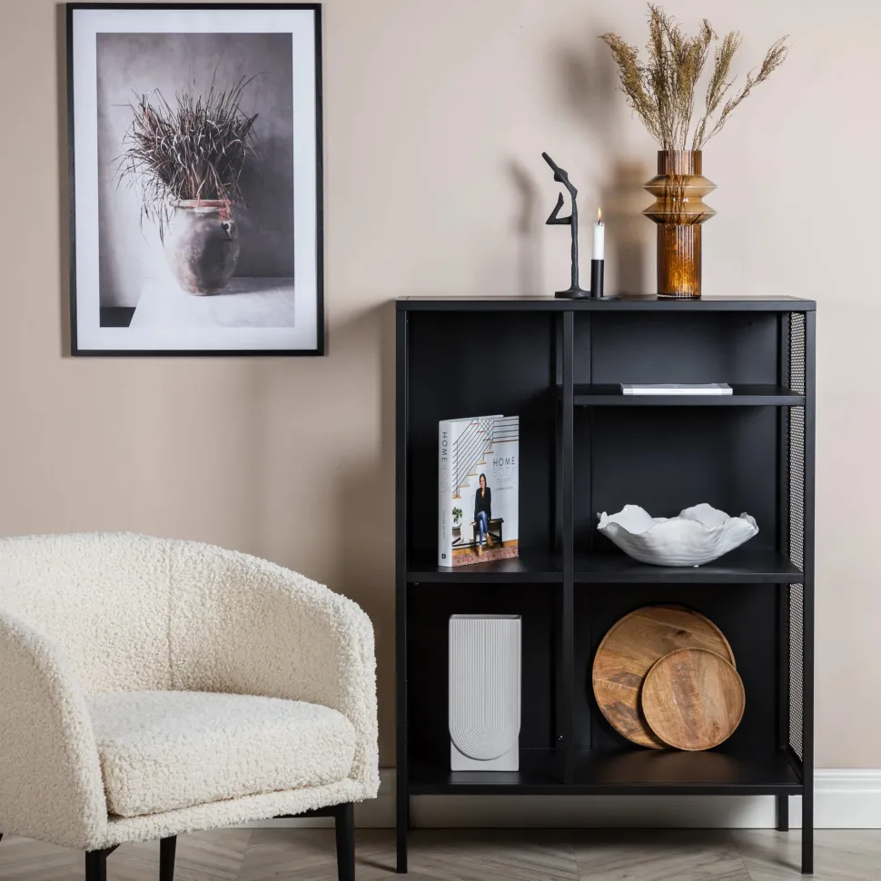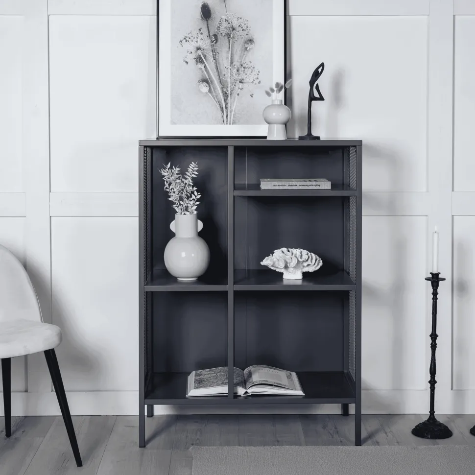 Gaas, in stoer industrieel ontwerp gemaakt van gepoedercoat zwart staal met drie reliëfvlakken op verschillende hoogtes. Netten aan de zijkanten van de kast voor een extra touch, rustend op 4 gepoedercoate zwarte poten van staal. Afmetingen: Lengte: 80 cm, breedte: 40 cm, hoogte: 110 cm. Lichtere montage vereist.