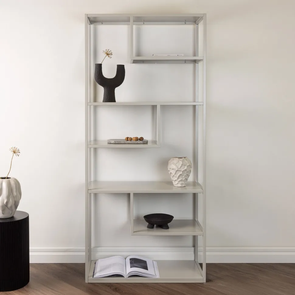Keonte, in modern industrieel ontwerp gemaakt van lichtgrijs gepoedercoat staal met verschillende reliëfvlakken op verschillende hoogtes. Afmetingen: Lengte: 85 cm, breedte: 35 cm, hoogte: 188 cm. Lichtere montage vereist.