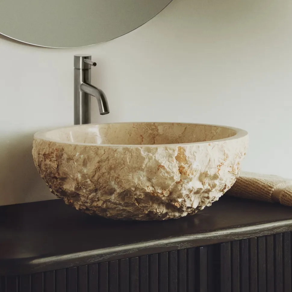 De marmeren wastafel is een uniek product dat met de hand is gemaakt van marmer dat rechtstreeks afkomstig is van het eiland Java. Elk exemplaar is zorgvuldig gevormd met traditioneel gereedschap, waardoor het unieke aderen en kleurschakeringen krijgt: de esthetische waarde van imperfectie, typisch voor dit materiaal. De gepolijste afwerking aan de binnenkant versterkt de schittering van de steen. De buitenkant is gebeiteld, wat textuur toevoegt aan het oppervlak. De massieve samenstelling van marmer zorgt voor een hoge weerstand en duurzaamheid, zelfs in vochtige omgevingen en intensief gebruik, zoals in de badkamer.