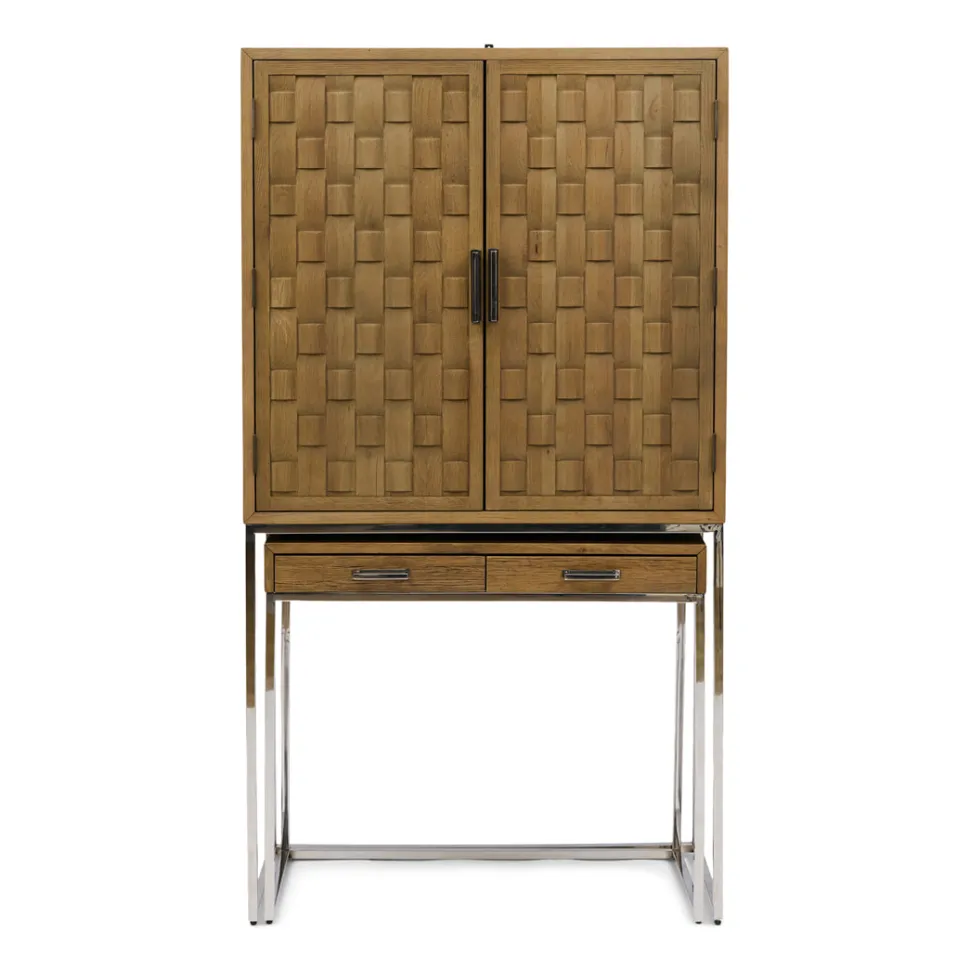 - Deze wandkast op hoge poten heeft een frame van roestvrij staal en metalen handgrepen. De deuren, gemaakt van teruggewonnen eikenhout, lijken met de hand geweven en geven de kast een unieke uitstraling. Binnenin vind je drie ruime vakken en vier kleinere vakken achter twee andere deuren, evenals een rek voor wijnglazen en een magnetische sluiting voor extra gebruiksgemak. Een bijpassend dressoir met twee lades kan onder de barkast worden geplaatst voor een samenhangende look, of apart worden gebruikt om dezelfde stijl door de hele ruimte te laten terugkomen.