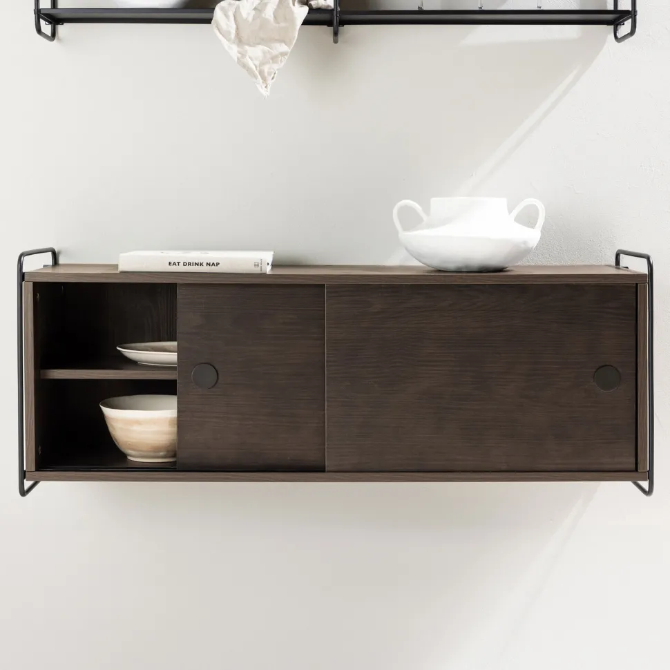 Geef je muren leven en laat ze je persoonlijke stijl weerspiegelen met behulp van onze trendy wandplank in donkerbruin hout uit de Marketta serie! Met een slank zwart stalen frame ondersteunt deze wandplank een elegante kast met twee stijlvolle deuren in donkerbruin MDF. Ervaar de voordelen van het discreet opbergen van je spullen en voeg tegelijkertijd een modern tintje toe aan je muren.