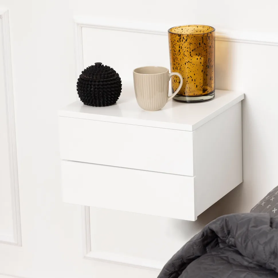 De ideale partner voor elke slaapkamer als je van een minimalistische, strakke uitstraling houdt. Met strakke lijnen en een wit geschilderd oppervlak zal dit nachtkastje je slaapkamer niet overnemen. Het is gemakkelijk om het nachtkastje naast je bed op de gewenste hoogte op te hangen. Met 2 laden heb je genoeg ruimte voor boeken, glazen en wat je ook nodig hebt.