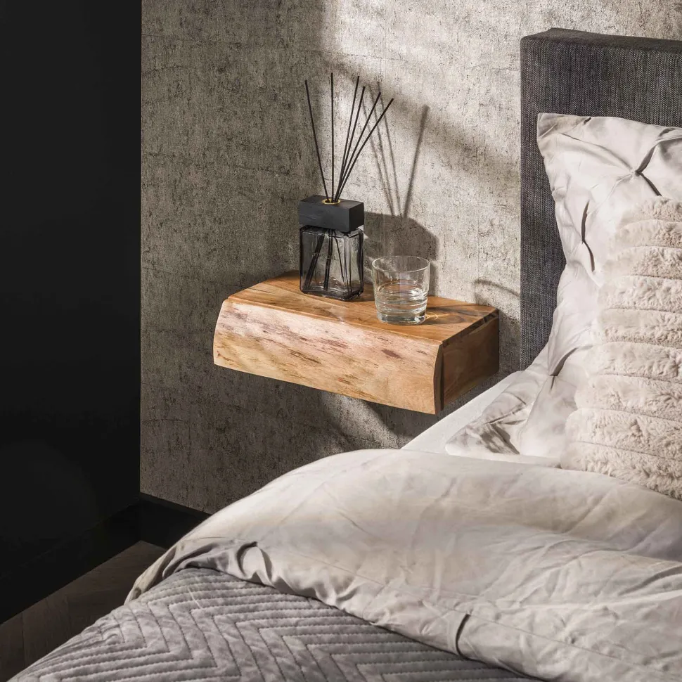Het hangende nachtkastje ‘Hind’ van LifestyleFurn is een natuurlijke en karaktervolle toevoeging aan de slaapkamer. Deze set van 2 stuks is vervaardigd uit massief acaciahout en straalt warmte en ambacht uit. De lade is afgewerkt met een opvallende live edge structuur, waarbij de natuurlijke vormen van het hout zichtbaar blijven. Dit geeft elk kastje een uniek en organisch karakter.
