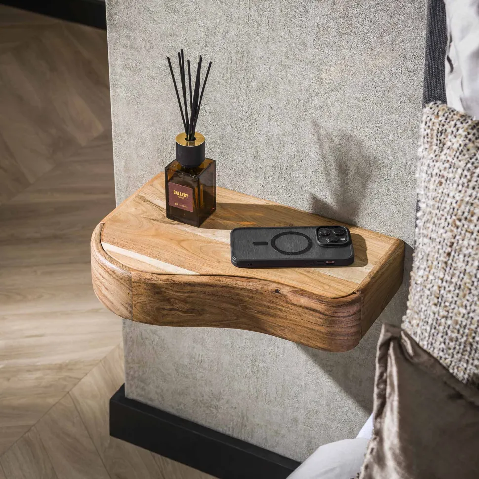 Het zwevende nachtkastje Organic is vervaardigd uit massief acaciahout en afgewerkt met een matte, transparante lak die de natuurlijke houtstructuur mooi benadrukt. Het kastje beschikt over één greeploze lade en kan eenvoudig aan de muur bevestigd worden. Hierdoor lijkt het te zweven en blijft de vloer vrij.