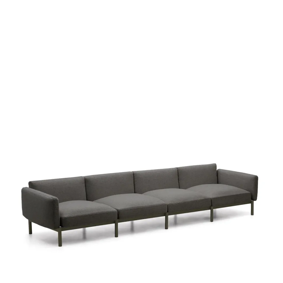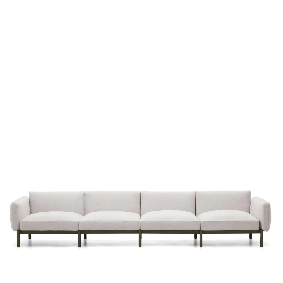 - Sorells modulaire beige beklede 4-zitsbank voor buiten met aluminium structuur met afwerking in grijs.