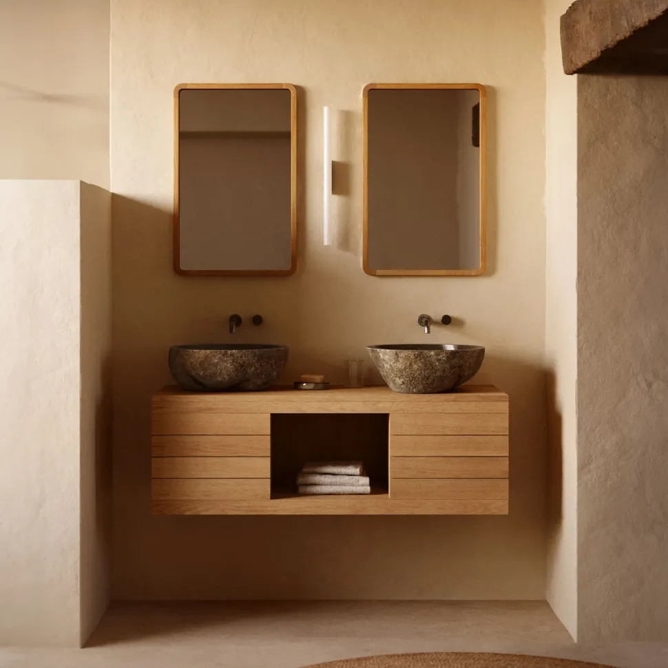 De Yenit collectie is gemaakt van vochtbestendig massief teakhout zodat u kunt ontspannen in een oosterse design spa zonder uw huis te verlaten. Laat zien dat je badkamer ook stijlvol is.