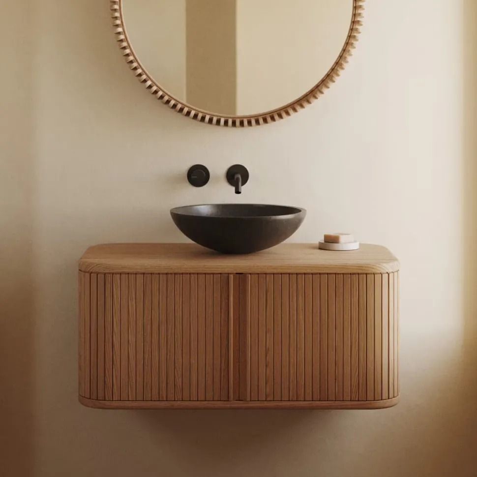 Het team van Kave Home heeft een opvallende collectie gemaakt. Mailen heeft een modern ontwerp met organische vormen, is gemaakt van essenfineer en heeft schuifdeuren van houten latten.