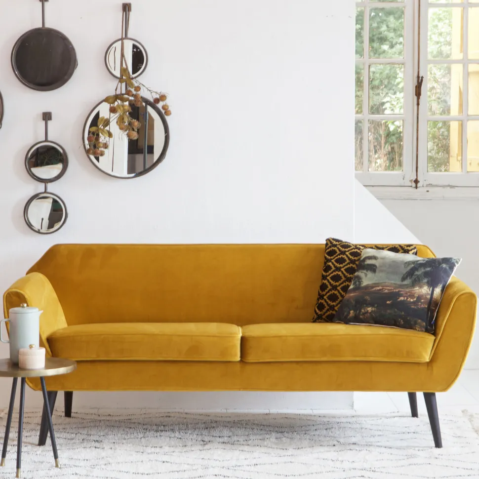 De WOOOD sofa Rocco is een prachtige 2-zits bank met zwart gelakte poten. De sofa is gestoffeerd in de kleur okergeel met een 100% polyester fluwelen stof. Het is een sofa met comfortabele zit waarvan de zit- en de rugkussens vast gestoffeerd zijn.