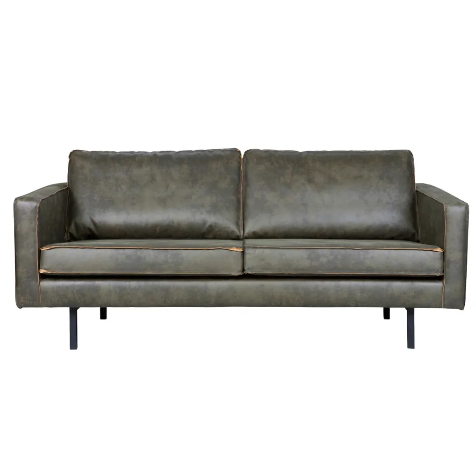 De Rodeo bank is opgebouwd uit een combinatie van massief hout, spaanplaat, polyurethaan schuim met een dichtheid van 25 kg/m3 en een zigzag vering. De zitting bevat een polyurethaan schuim met een dichtheid van 30 kg/m3 (T3037). De rugleuning bestaat uit een combinatie van 70% gesneden schuim en 30% siliconen. Deze Rodeo is bekleed met een lederlook. Onze Copa lederlook heeft een unieke uitstraling en is door het gebruik van leer restanten een duurzame keuze! De lederlook bestaat uit 70% vezels van rundleder, 30% polyester en heeft een Martindale van 30.000. Het materiaal is opgebouwd uit twee onderdelen: de onderlaag bestaat uit gerecyclede leervezels, wat zorgt voor de natuurlijke uitstraling. De bovenste laag is een polyester afdeklaag die het leer beschermt en oneffenheden voorkomt. Hierdoor wordt het een stevige combinatiestof. De microvezel is gebreid van zeer kleine, synthetische vezels. Deze productietechniek zorgt voor de stevigheid en een fijn, zacht gevoel. De stof is zeer kleurvast. Tijdens het gebruik zal het uiterlijk en de structuur van de stof zijn natuurlijke kenmerken meer laten zien, dit verandert niks aan de duurzaamheid en kwaliteit.