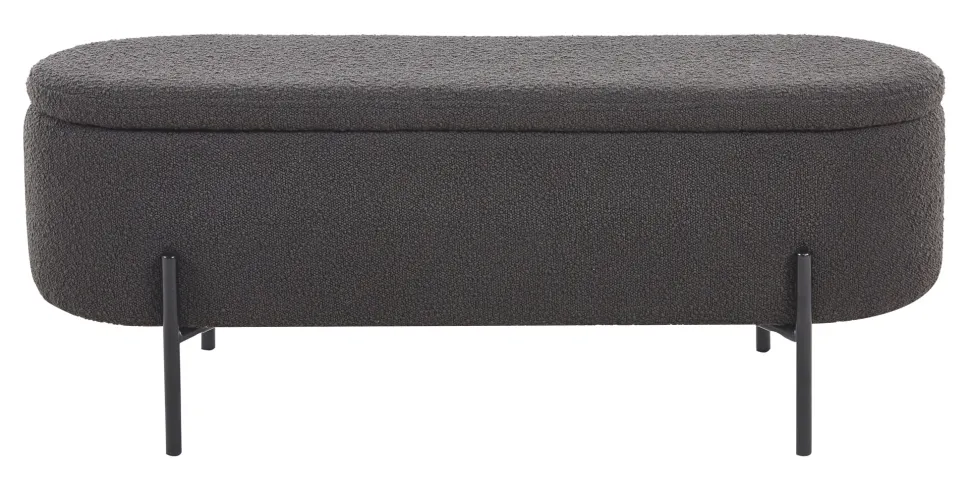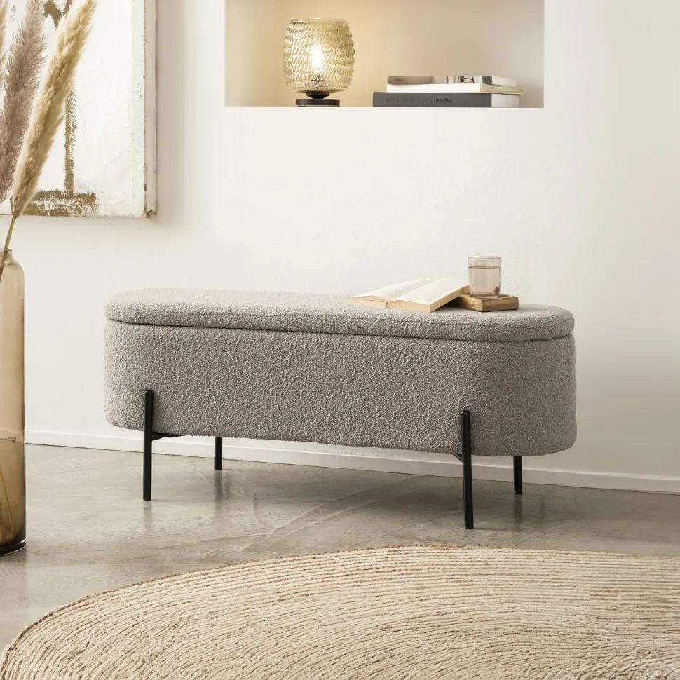 Als je op zoek bent naar Scandinavisch design met praktische voordelen, dan is deze bedbank met trendy bouclé bekleding de juiste keuze. De gestoffeerde kruk scoort niet alleen met zijn vooruitstrevende design, maar biedt ook een slimme opbergfunctie achter het opklapbare deksel. Of het nu gaat om dekens, dekbedovertrekken of kleding – je kunt stijlvol orde scheppen in de bedbank en rondslingerende spullen opbergen. De bouclé stof, die allang zijn weg heeft gevonden naar onze woon- en slaapkamers, straalt warmte en geborgenheid uit. Bovendien weerspiegelt de stof met zijn wollige look vakkundig de essentie van de populaire Scandi-stijl. Het designframe met hoge poten is gemaakt van gepoedercoat zwart metaal en maakt de look helemaal af.
