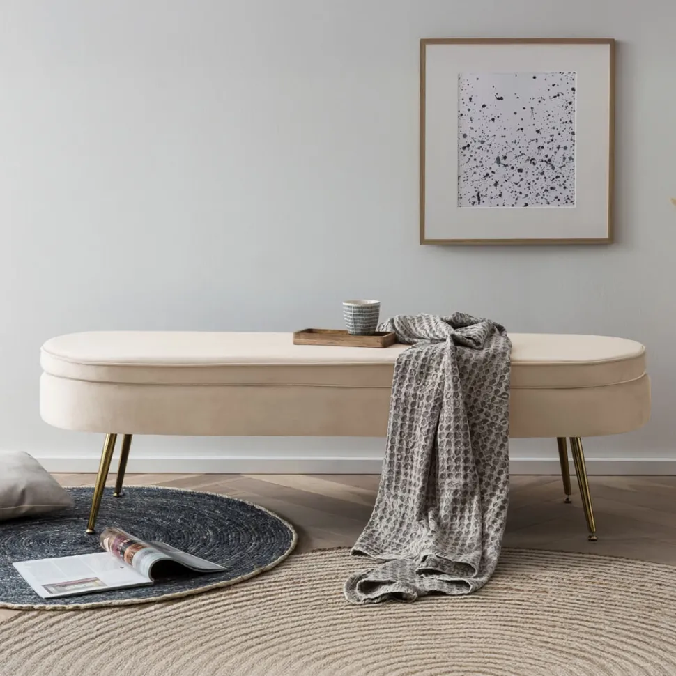 Glamoureus, elegant en praktisch – de poef met een stijlvolle stoffen bekleding in fluweel-look. Het 4-voets frame van goudkleurig metaal zorgt niet alleen voor een stevige stand, maar vormt ook een mooi contrast met de bekleding van de poef. Dankzij de beklede zitting is dit meubel ideaal als extra zitplaats of als voetensteun voor een bank. Maar deze voetenbank komt ook goed tot zijn recht als hij individueel wordt opgesteld. De ovale vorm zorgt voor een zachte uitstraling. Deze fauteuil kruk is een echt juweeltje en zal een visueel hoogtepunt in je huis worden.
