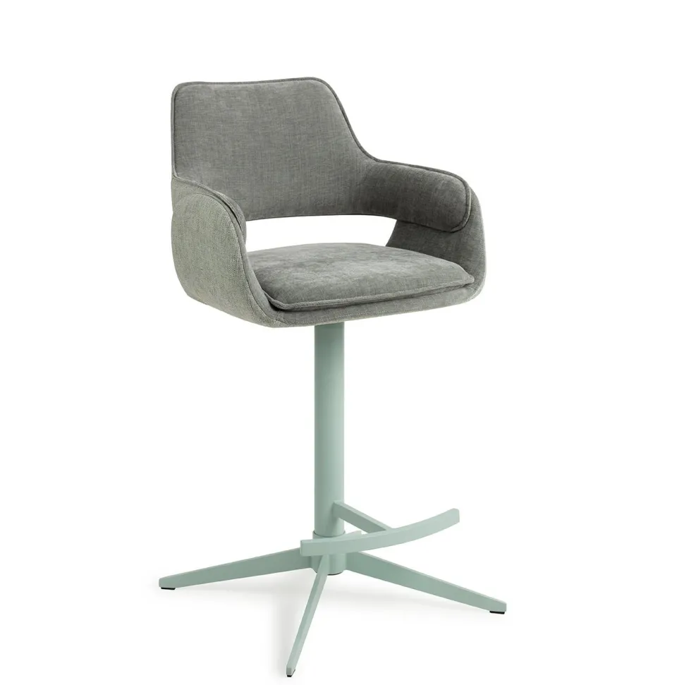 Upgrade je eetervaring met de Oketo barkruk, voorzien van tweedelige bekleding in verschillende stoffen, gecombineerd met een bijpassend gepoedercoat frame. Het frame heeft een 360 graden draaifunctie met automatische terugkeer.