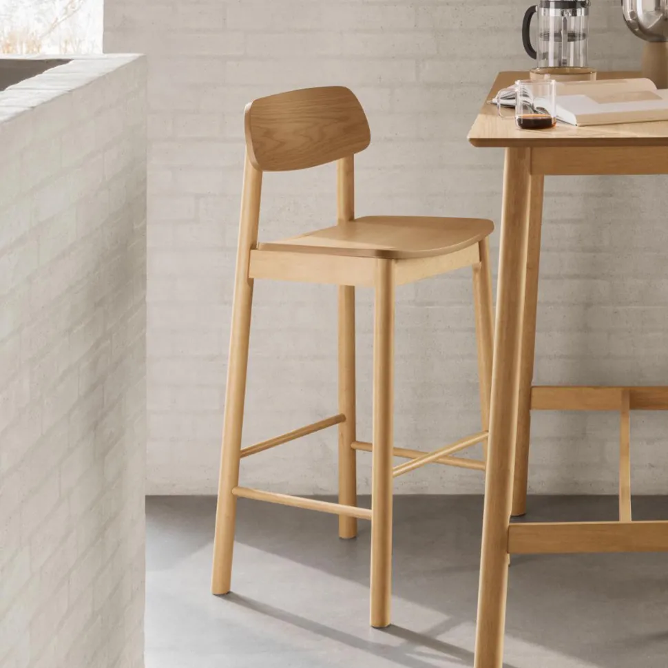 Deze barkruk met rugleuning combineert Scandinavische esthetiek met hedendaagse invloeden. Hij brengt warmte in elke privé-eetkamer met de geselecteerde materialen en stevige constructie in een houtgelakte look. De afgeronde elementen geven de kruk een zachte uitstraling en versterken zijn uitnodigende karakter.