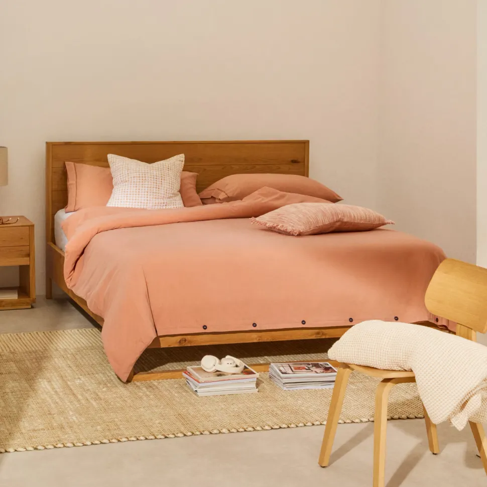 - Bed van eikenfineer met naturel afwerking voor een matras van 180 x 200 cm.
