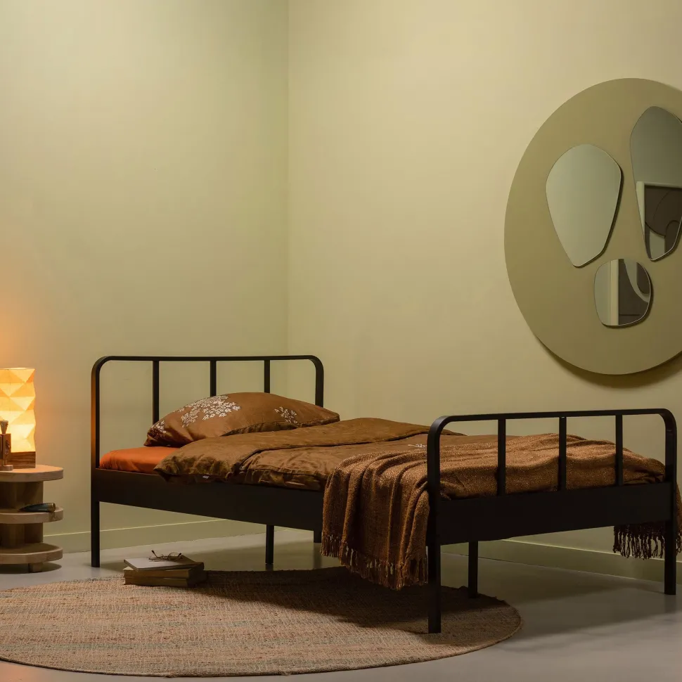 Het Mees bed, uit de WOOOD-collectie, wordt gekenmerkt door het luchtige spijlenframe en de matzwarte afwerking. Het bed is gemaakt van gepoedercoat metaal en heeft een zeer sterke constructie. Het metalen bed biedt ruimte voor een matrasmaat van 120×200 cm. Van lattenbodem tot bedrand is 14 cm hoog.
