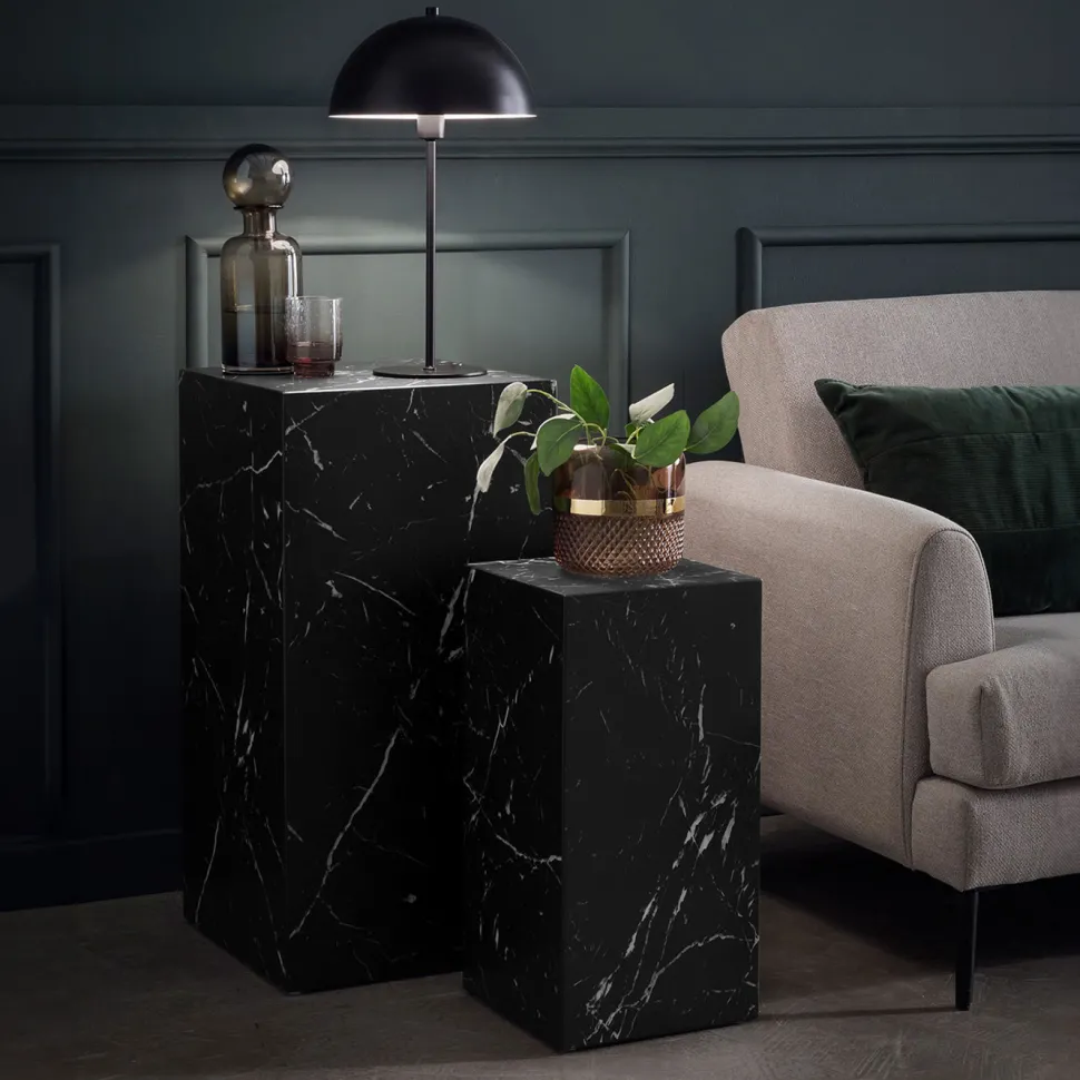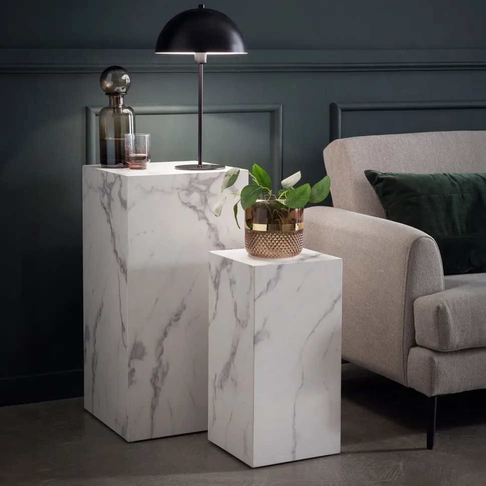 Met deze chique bijzettafelset van 2 ziet je woonkamer er veel eleganter uit. De eenvoudige kubusvorm met veel oppervlak accentueert de geweldige witte marmeren look. De bijzettafel kan op verschillende manieren worden gebruikt, niet alleen naast de bank, maar ook als nachtkastje of als vrijstaande blikvanger. De verschillende hoogtes kunnen naar wens stijlvol naast elkaar worden geplaatst of afzonderlijk op verschillende plekken in de woonkamer worden gebruikt. De set is ook een stijlvolle blikvanger in je huis als bloemen- of accessoirekruk.