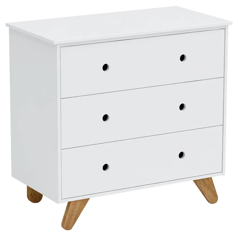In de kinderkamer en speelkamer kan nauwelijks genoeg opbergruimte zijn. Deze commode met drie laden bewijst dat dit ook op een moderne en stijlvolle manier in de inrichting kan worden geïntegreerd. Het eenvoudige Scandinavische ontwerp wordt versterkt door de afgeschuinde poten van grenenhout en de greepgaten. Er zijn drie grote laden voor kleding, speelgoed of boeken. De ruimte op de commode kan ook gebruikt worden als opbergruimte of plankruimte. De verhoogde positie van de commode geeft hem een luchtige, lichte uitstraling waardoor het meubelstuk niet te massief oogt, ook niet in kleinere kamers. Combineer de commode met de bijpassende meubels uit de collectie of integreer het meubel moeiteloos in een bestaande inrichting. Hoogwaardige metalen uittrekelementen in de laden zorgen ervoor dat je lang van de commode kunt genieten.