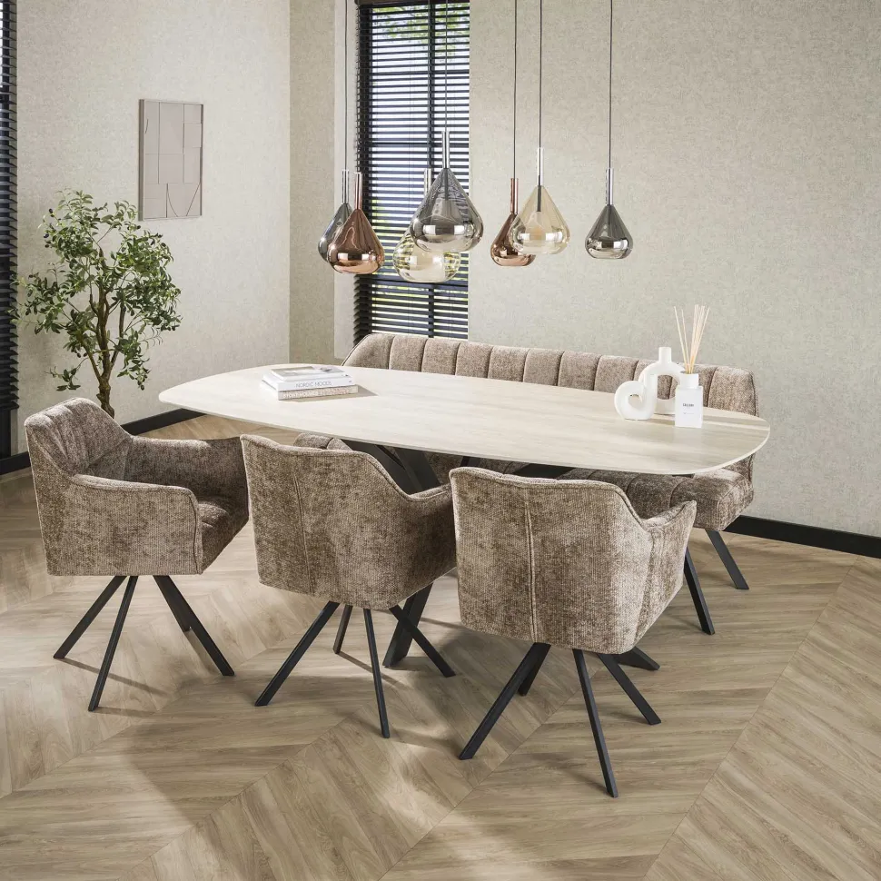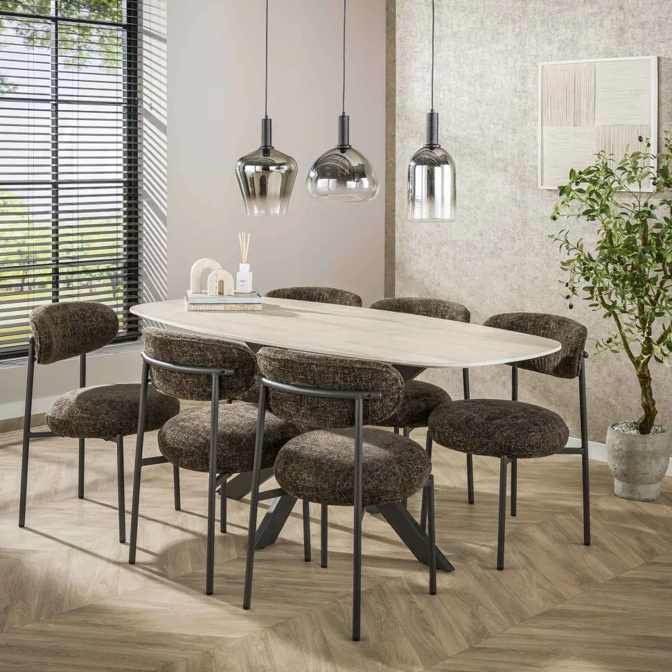 De Deens ovale eettafel Laycie van LifestyleFurn combineert Scandinavische eenvoud met opvallend design. Het 3D-keramieken blad in travertinlook voelt luxe aan, is duurzaam en onderhoudsvriendelijk, en krijgt door de textuur een levensechte uitstraling. Het gepoedercoate stalen onderstel geeft de tafel een stevig fundament en een modern contrast met het warme blad.