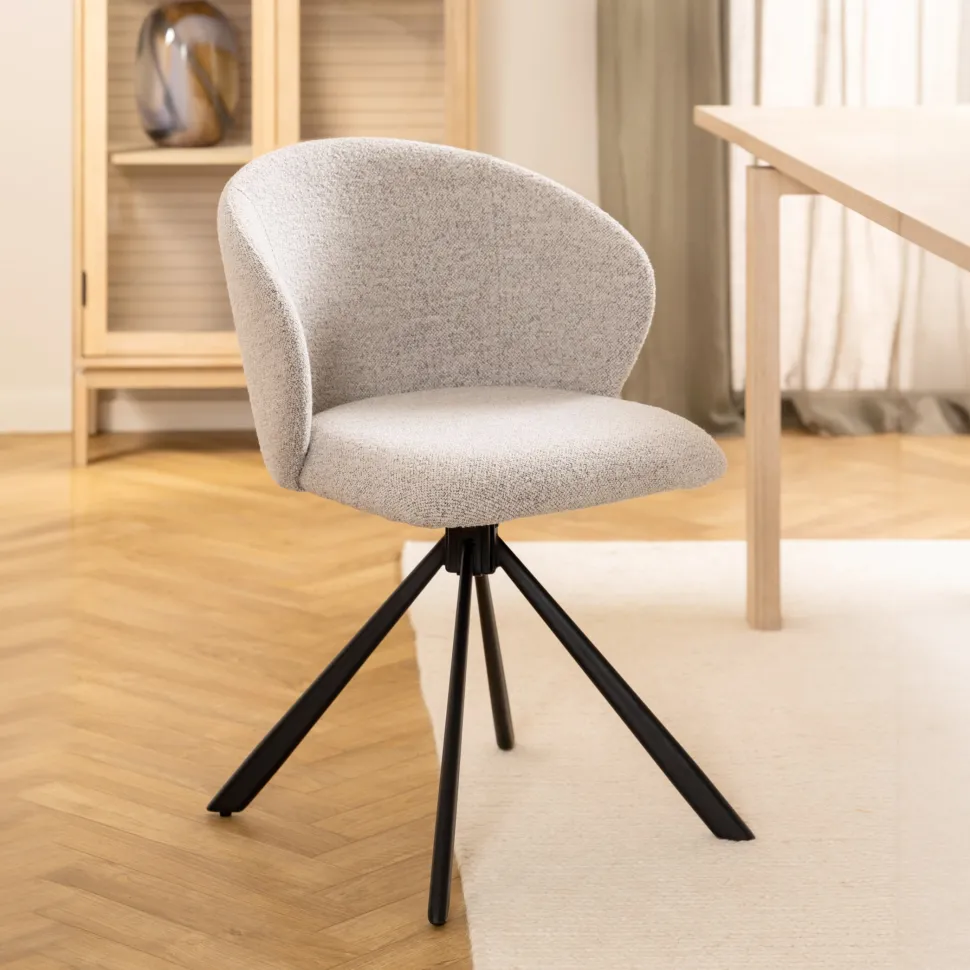 Speciale gelegenheden of alledaags dineren, deze eetkamerstoel kan het allebei. Je hoeft niet op te staan of de stoel te draaien dankzij de draaifunctie. De organische rondingen van de zitting en het slanke zwart metalen onderstel geven de stoel een vrouwelijke uitstraling. Gewikkeld in een zachte bouclé stof met een krullende structuur, maakt de beige bekleding de stoel interessant om naar te kijken.